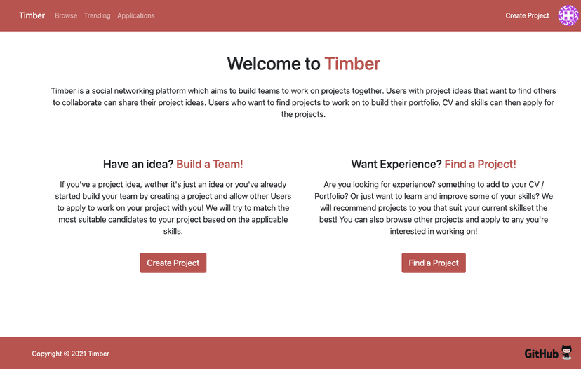 Timber is a social networking platform to connect professionals and hobbyists together. It's main purpose is to join people who are looking to work on projects in their spare time. It can be ostensible nowadays for a student or a person aspiring to join the industry; to find and collaborate with and gain team building skills. Our purpose is to mediate these worries of finding a team and allow the users to match with each other based on their personal similarities and interests. Our goal is to allow people to access this in a digestible fashion. Removing high barriers to entry such as CVs, lengthy cover letters and experience prerequisites. Users on this platform not only can match with these projects but can also use them to gain and show their experience on their professional portfolios.